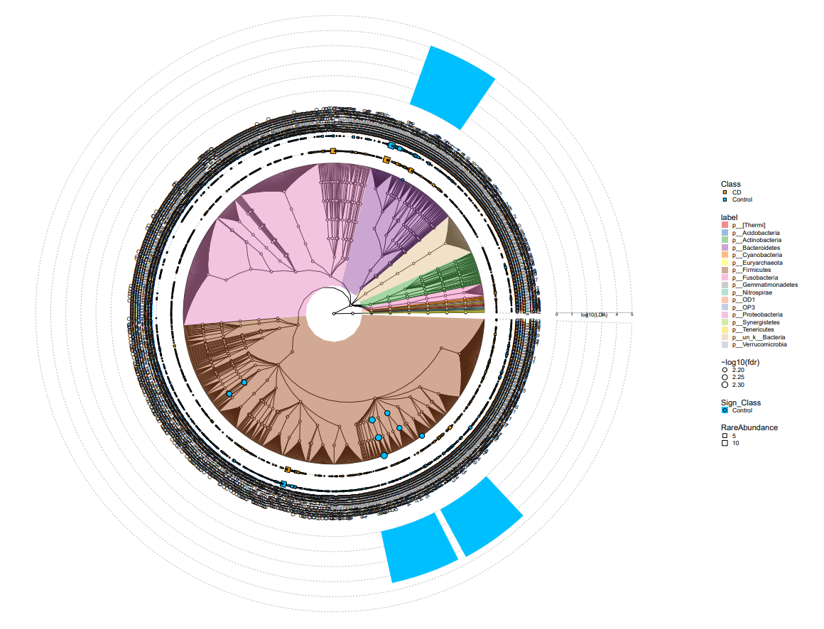 p5 <- p4 + ggnewscale::new_scale("fill") + geom_fruit( geom = geom_col, mapping = aes( x = LDAmean, fill = Sign_Class, subset = !is.na(LDAmean) ), orientation = "y", offset = 0.3, pwidth = 0.5, axis.params = list(axis = "x", title = "Log10(LDA)", title.height = 0.01, title.size = 2, text.size = 1.8, vjust = 1), grid.params = list(linetype = 2) )